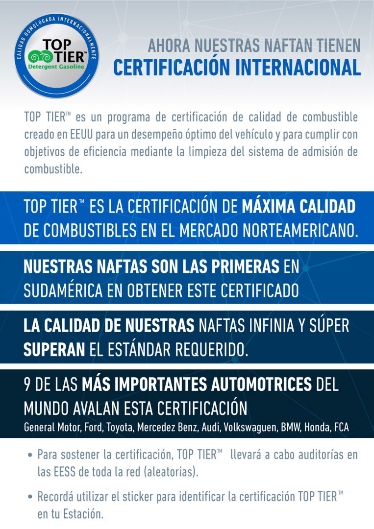 Nuestras naftas SUPER e INFINIA de YPF, ahora tienen la certificación internacional TOP TIER.